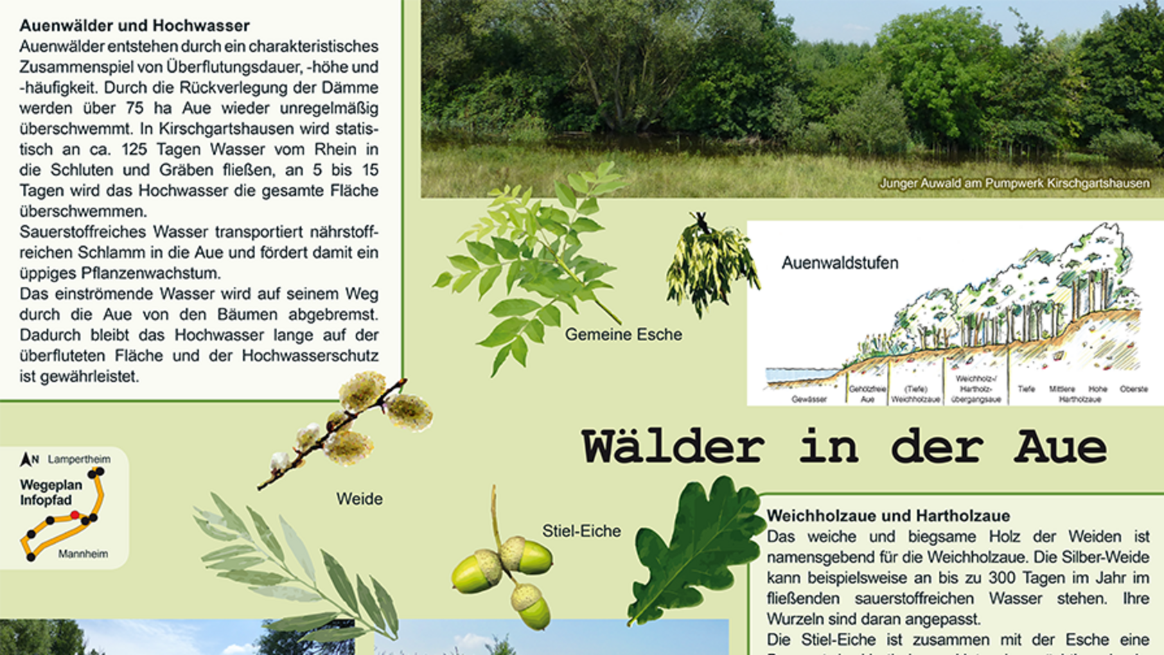 Am 1. Juli 2015 wurde der Infopfad Kirschgartshausen eröffnet. Auf acht Infotafeln können Sie mehr über das Bauprojekt und die naturnahe Entwicklung der Aue erfahren. Je nach Rheinwasserstand bieten sich interessante Ausblicke in die Auenlandschaft.