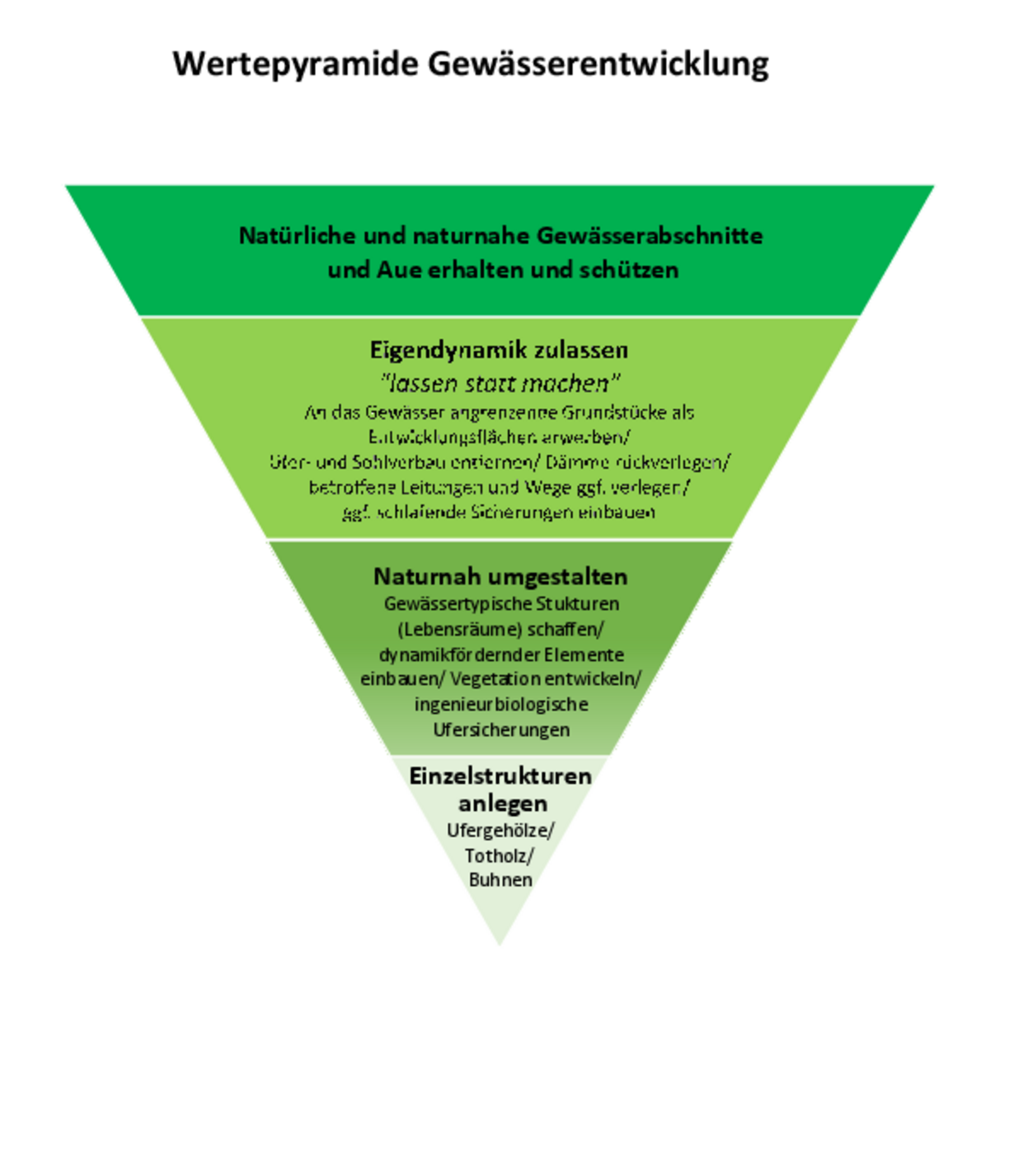 Ziel von Revitalisierungsmaßnahmen ist die Wiederherstellung der Lebensraumfunktion, oder übersetzt in die strukturelle Bewertung nach LAWA-Feinverfahren (BW): GeStruk Strukturklasse 1 – 3. Dort geht man davon aus, dass sich die gewässerökologisch notwendigen Strukturen durch die Gewässerdynamik selbst gestalten und erhalten. Vorrangig sind daher Maßnahmen umzusetzen, die eine eigendynamische Entwicklung ermöglichen:
