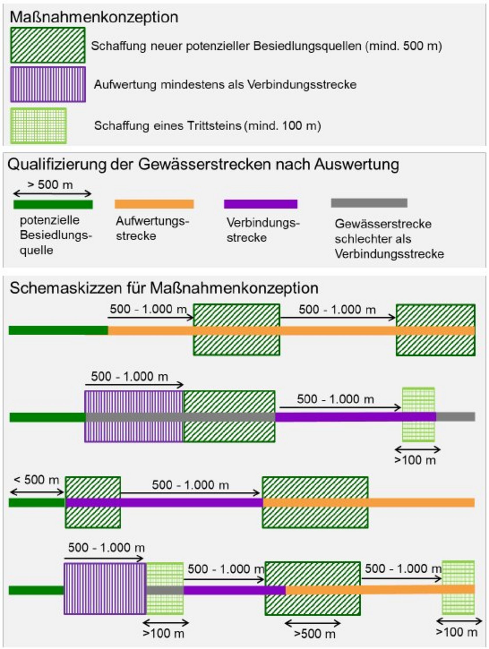 In diesen Maßnahmenkonzeptionen werden  – soweit möglich – das Strahlwirkungs- und Trittsteinkonzept berücksichtigt. Wenn es Hinweise auf potenzielle Besiedelungsquellen im Betrachtungsraum gibt, werden diese in die Maßnahmenplanung aufgenommen, damit die ökologische Funktionsfähigkeit des gesamten Gewässerabschnittes verbessert wird.