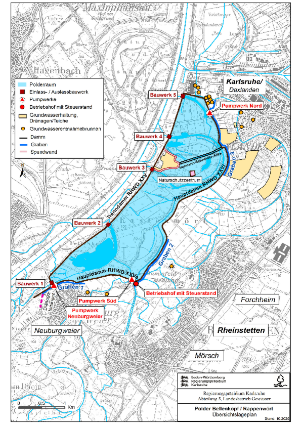 Mit dem Rückhalteraum Bellenkopf/Rappenwört wird auf einer Fläche von 510 ha ein Hochwasserrückhaltevolumen von 14 Mio. m³ geschaffen. Im Hochwasserfall wird Wasser vom Rhein in den Polder eingeleitet (Retention), so wird eine Reduktion des Rheinwasserspiegels erreicht.