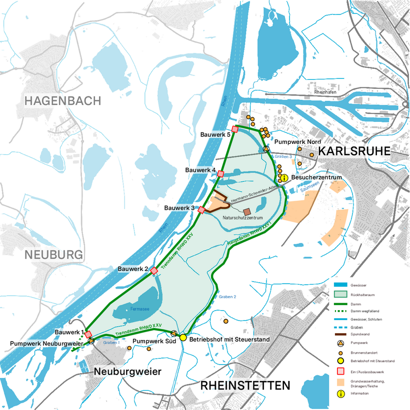 Über fünf Ein- und Auslassbauwerke im Rheinhauptdamm XXV kann der Rückhalteraum kontrolliert gefüllt und entleert werden. Die Steuerung des Rückhalteraums erfolgt zentral über eine Steuer- bzw. Betriebszentrale, die am Pumpwerk Süd im Bereich der Kläranlage Rheinstetten geplant ist. Die Betriebszentrale ist auch Stützpunkt des Betriebspersonals und Lagerstützpunkt der für die Unterhaltung des Polders erforderlichen Fahrzeuge und Gerätschaften. Hochwassereinsätze finden unregelmäßig statt.