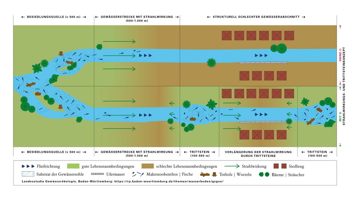 Für die räumliche Anordnung der Maßnahmenbereiche werden die Anforderungen aus dem sogenannten Strahlwirkungs- und Trittsteinkonzept zu Grunde gelegt. Nach diesem Konzept haben intakte, naturnahe Gewässerabschnitte eine positive Wirkung auf benachbarte, strukturell defizitäre Gewässerabschnitte. Soweit es gelingt, die strukturell defizitären Abschnitte durch entsprechende Maßnahmen in ihrer Struktur zu verbessern, können die Organismen (Kleinstlebewesen, Fische) einwandern und sich dort ansiedeln. Längere Abschnitte mit schlechter Struktur können durch sogenannte Trittsteine aufgewertet werden. Für die Landesstudie Gewässerökologie wurden aktuelle Erkenntnisse aus verschiedenen Forschungsvorhaben zu Länge und Qualität entsprechender Fließgewässerabschnitte auf Baden-Württemberg übertragen.