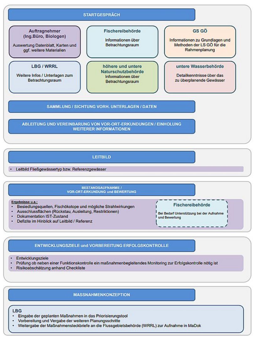 Für die G. I. O. werden zunächst Rahmenplanungen auf der Ebene der Betrachtungsräume zur Verbesserung der Gewässerstruktur und ökologischen Funktionsfähigkeit erstellt. Dabei sind die bisherigen Ergebnisse der landesweiten Untersuchungen der Entwicklungspotenziale zu berücksichtigen.
