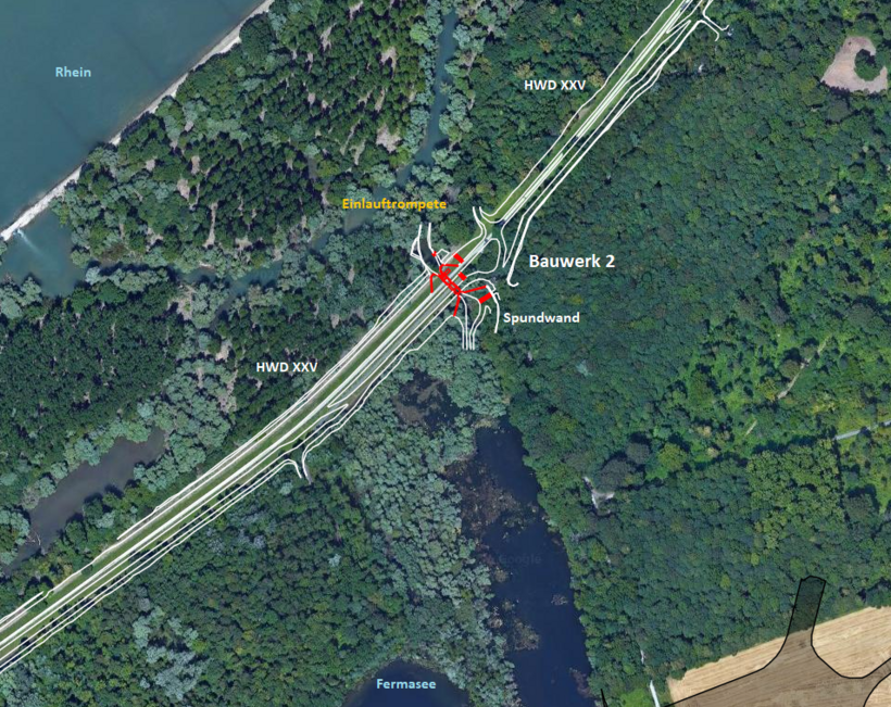 Das Bauwerk 2 liegt im Hochwasserdamm XXV an der Stelle der abzubrechenden, bisherigen Bellenkopfschließe, die den Fermasee mit dem Altrhein im Rheinvorland verbindet.