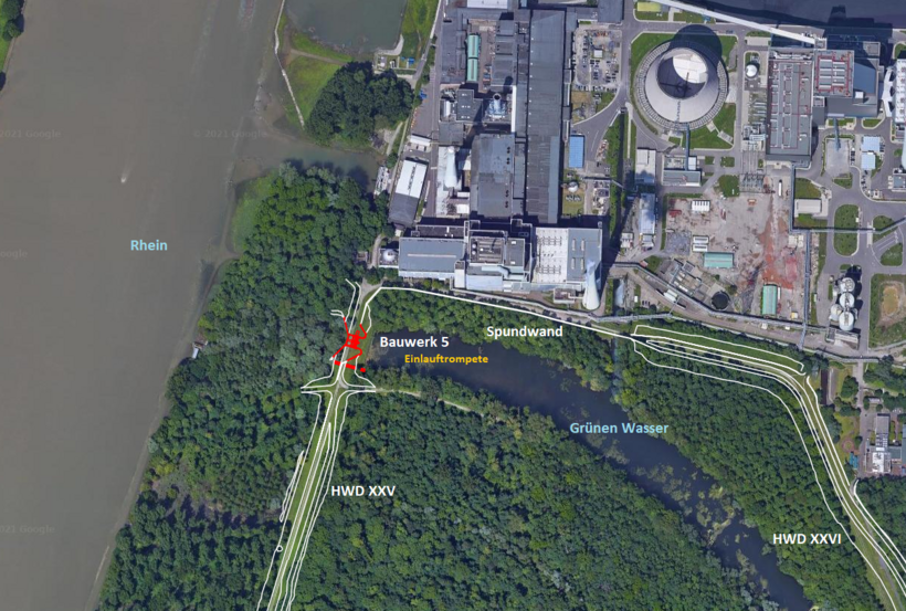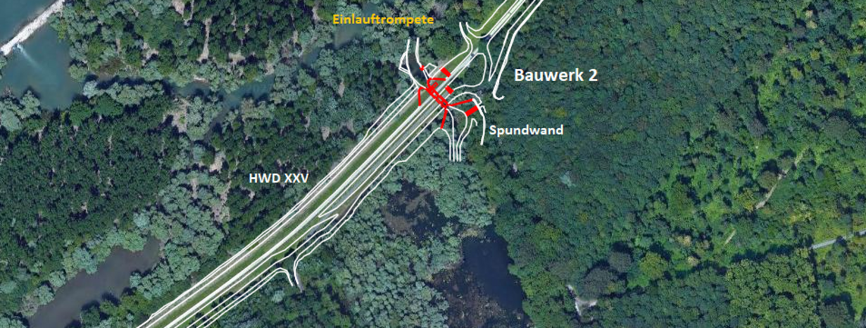 Das Bauwerk 1 liegt im neuen Dammübergangsstück zwischen dem Hochwasserdamm XXV und dem neuen Hochwasserdamm XXVa. Dieses Bauwerk wird ausschließlich zum Einlass von Rheinwasser genutzt.