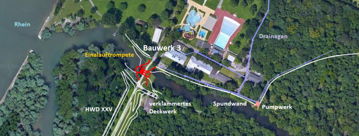 Das Bauwerk 3 liegt im Hochwasserdamm XXV an der abzubrechenden, bisherigen Südlichen Rappenwörtschließe, die den rheinseitigen Altrhein mit dem binnenseitigen Rappenwörter Altrhein verbindet.