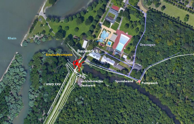- Im Retentionsfall wird ein Zug der Anlage in verschiedenen Öffnungsgraden zum Einlass von Rheinwasser genutzt.