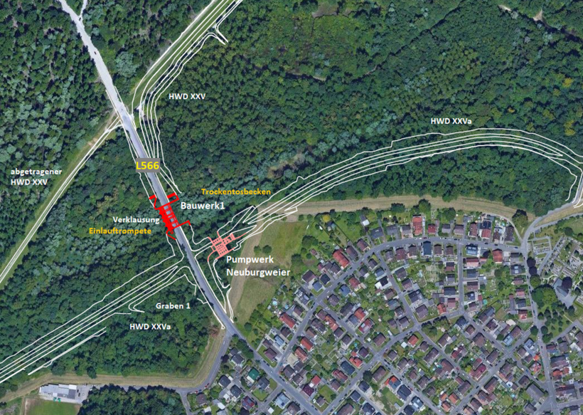 Es ist eine fünfzügige Anlage geplant. Der Mittelteil führt den vorhandenen Graben auf der unveränderten Sohlhöhe durch das Bauwerk. Der Graben führt Wasser nach dem Überströmungsbeginn an der Mittelwasserschwelle entlang. Die Sohlhöhe wird an das Geländeniveau der dort vorhandenen Schlut angepasst. Der Neubau der Landesstraße 566 wird als Brücke über das Bauwerk 1 geführt.