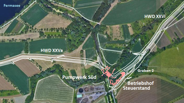 Das anfallende Wasser der Entwässerungsgräben wird über drei Pumpwerke in den Rückhalteraum gehoben: