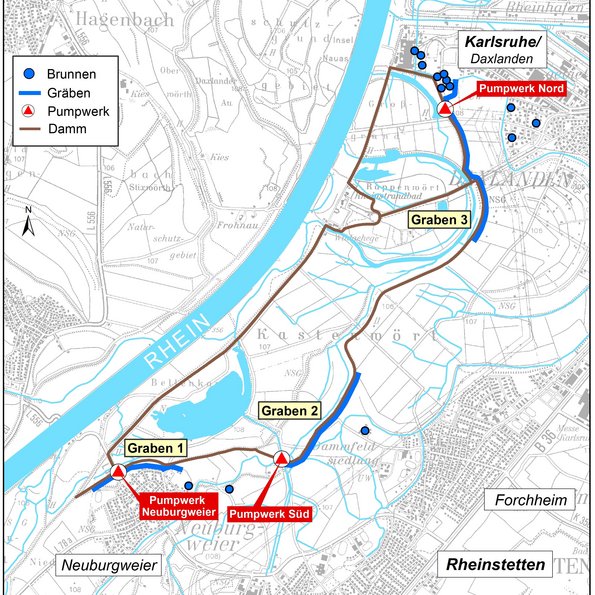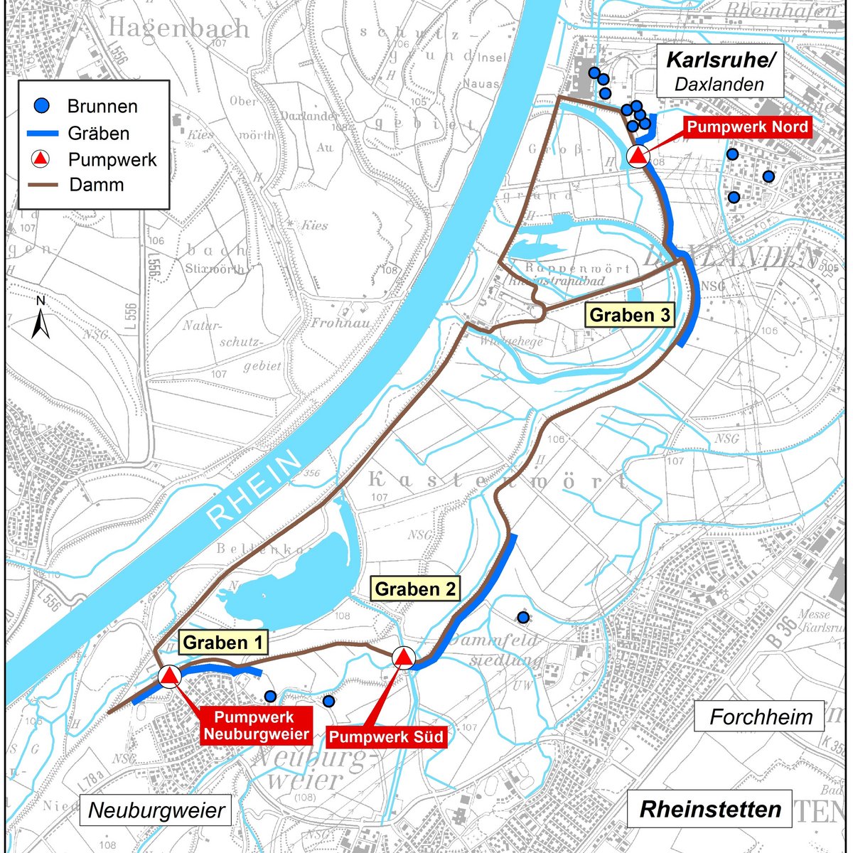 - Pumpwerk Neuburgweier nimmt das Druckwasser aus dem tief- und hochliegenden Graben von Neuburgweier sowie der Drainage am Grundstück des SC Neuburgweier auf.