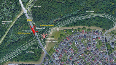 - Pumpwerk Süd nimmt das Wasser aus dem Federbach, der Holzlach und das Druckwasser aus „Graben 2“ auf.