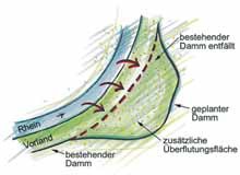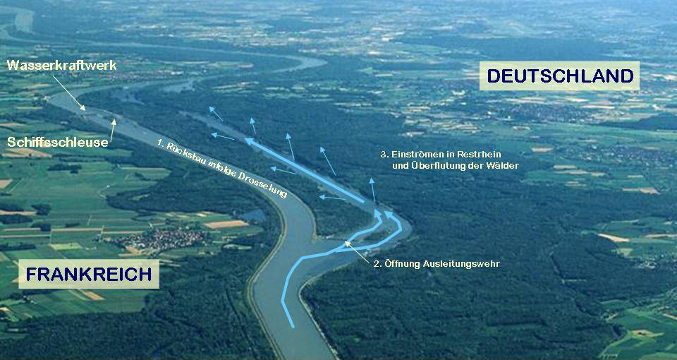 Vor dem Ausbau des Oberrheins strömten bei Hochwasser die Wassermassen in die hier ehemals vorhandenen Überflutungsgebiete des Rheins (Auwälder). Eine Erweiterung der ehemaligen Überflutungsgebiete ist nicht mehr möglich, da heute in der Rheinniederung sehr viele Menschen leben und die Landschaft bis fast an den Rhein hin intensiv genutzt wird.